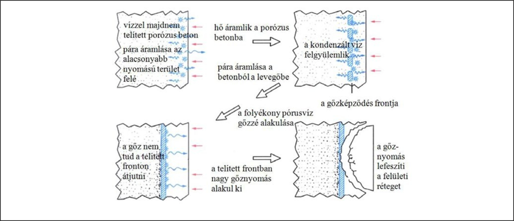 Ez a folyamat a beton tűzzel szembeni viselkedésének egyik gyenge pontja, ugyanis a szerkezeten lévő betontakarás leválását tudja okozni, ami az acélbetétek hőszigetelésének legfontosabb része. Maga a folyamat azon alapszik, hogy a beton technológiájából adódóan a szerkezetében lévő fizikailag kötött víz a felmelegedés hatására gőzzé alakul és az alacsonyabb nyomású zóna irányába áramlik, tehát a beton felszíne felé, ezen az úton pedig az acélbetétek felületén lecsapódik és kondenzvízként összegyűlik. Majd ezen a fronton a hő hatására újra gőzzé tud alakulni, és ez a gőznyomás képes lefeszíteni a felette lévő betonréteget, így az acélbetétek szabadon maradnak a felmelegedés hatásának közvetlenül kitéve. Ez a jelenség nagymértékben és kiszámíthatatlanul felgyorsítja a vasbeton szerkezet tönkremenetelét.