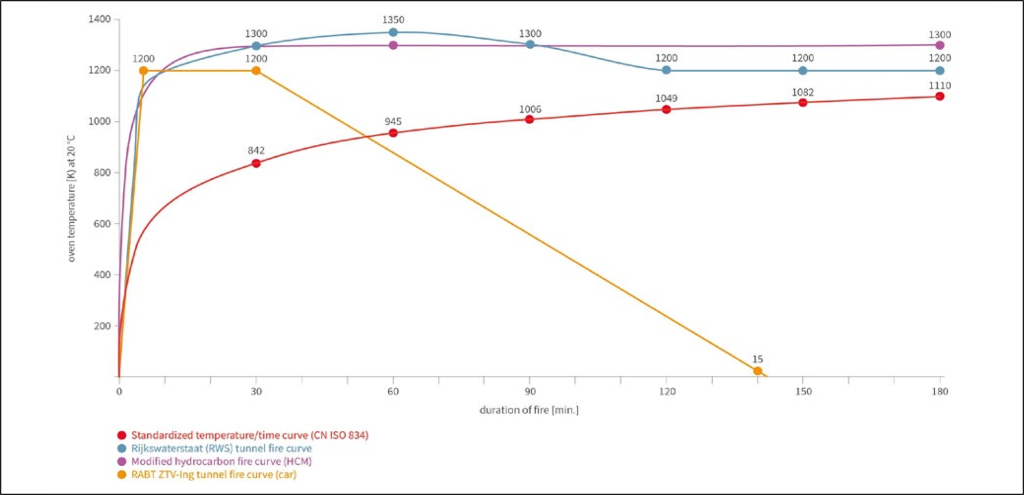 A vizsgálat közben a felfűtést kétféle alagúttűzgörbe alapján  végezték, az RWS, Rijkswaterstaat és a HCM, azaz a módosított szénhidrogéntűz alapján. Mindkét tűzgörbét kifejezetten üzemanyagot szállító autó alagútban keletkező tüzéről modellezték. Az RWS görbe a holland Közlekedési Minisztérium és a TNO/ Efectis vizsgálóintézet által kifejlesztett tűzgörbe, amely egy 50 m3-es üzemanyagtartály égését modellezi nagyjából 300 MW égéshővel 90–120 perces időtartamban, amely egy kifejezetten magas hőterhelés. A 6. ábra tartalmazza a grafikus összehasonlítását a fent említett tűzgörbéknek, amelyeken jól látszik, hogy milyen mértékben magasabb hőmérsékletekkel terheli az alagúttűz a szerkezeteket az általános szénhidrogén- és főleg a szabványos ISO834 tűzgörbével összevetve. Míg a szénhidrogén görbe 10 perc elteltével 1100 °C-ot ér el és aztán ezt konstans tartja, addig a módosított szénhidrogén-tűzgörbe (HCM) ugyanennyi idő alatt 1300°C-on tetőzik.