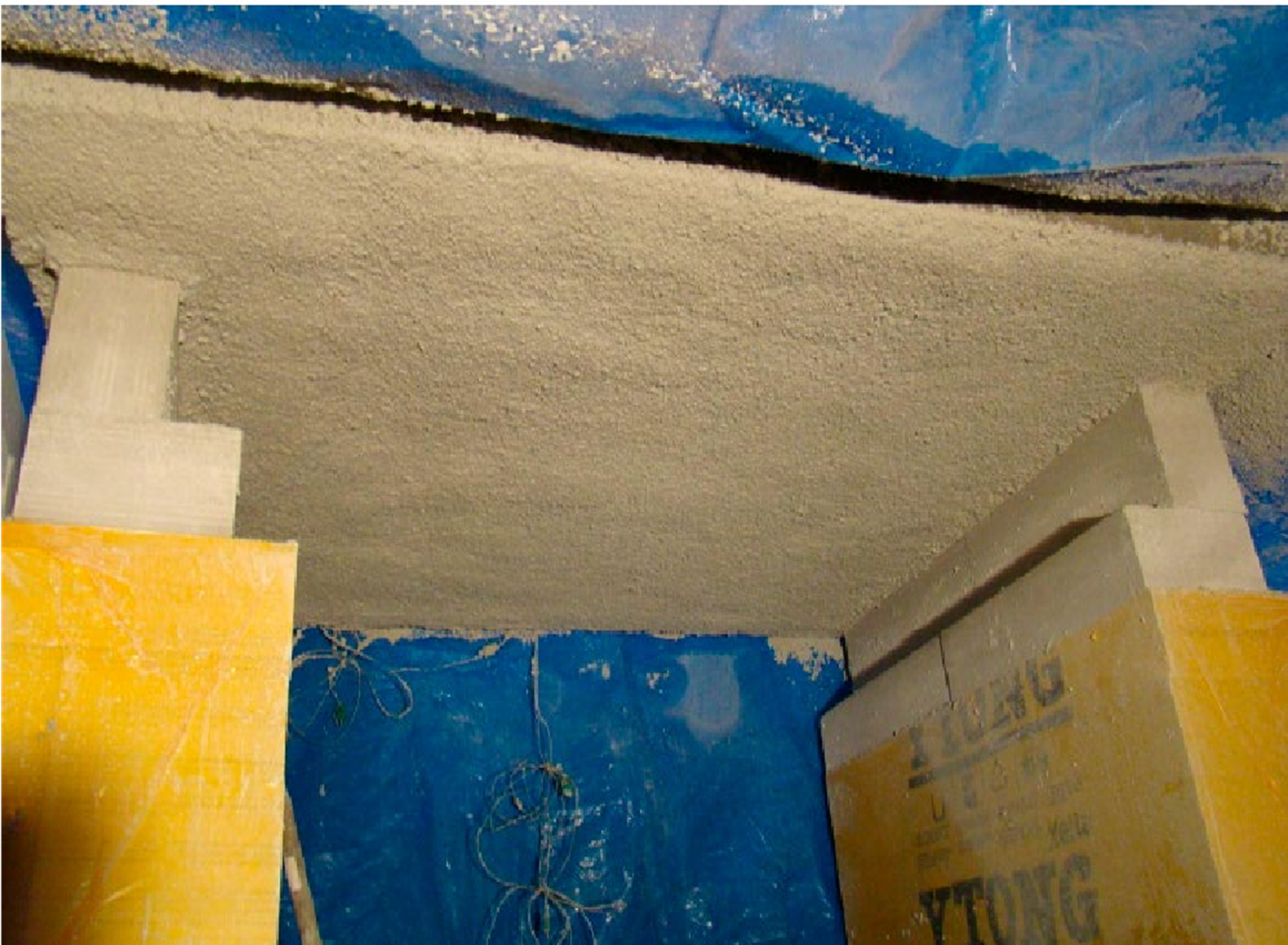 A Tecwool 825 tűzvédelmi habarcs, amely acélszerkezetek szénhidrogéntűz elleni védelmére alkalmas, alagútban való alkalmazása miatt vizsgálva lett betonfödém védelmére is. A holland Efectis vizsgálóintézetben végzett födémteszben 150 mm vastag és C30/37 anyagminőségű szerkezet 1,50×1,50 méteres támaszközzel lett beépítve (5. ábra), amely 23,8 és 50,5 mm vastag habarcsbevonatot kapott, mint minimum és maximum vastagság és a kettő között az interpoláció megengedett.